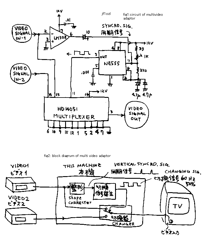 two video signal to one combined signal. NE555 makes 60Hz 50% duty signal.