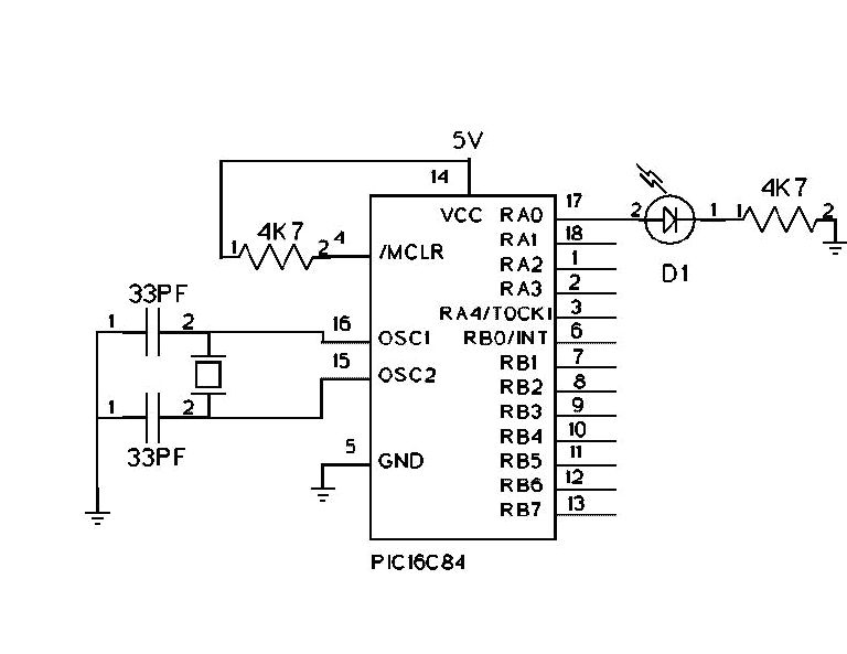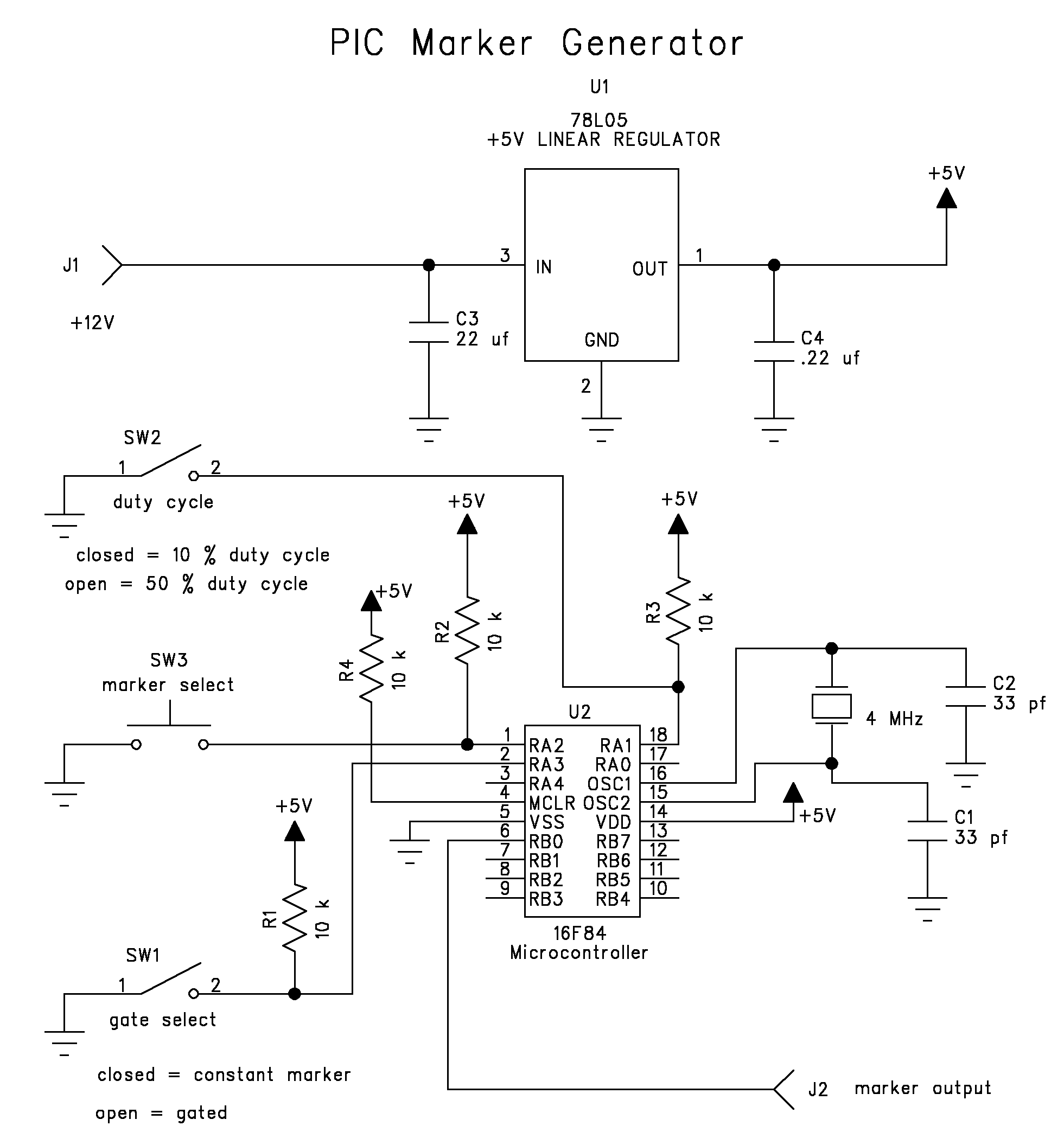 Pin Name Function / Connection 1 ra2 marker select, pulled up to +5V with a 10K resistor 2 ra3 gate select, pulled up to +5V with a 10 k resistor 3 ra4 no connect 4 MCLR pulled up to +5V with a 10K resistor 5 Vss Ground 6 rb0 marker output 7 rb1 no connect 8 rb2 no connect 9 rb3 no connect 10 rb4 no connect 11 rb5 no connect 12 rb6 no connect 13 rb7 no connect 14 Vdd +5V 15 osc2 connected to one side of 4 MHz xtal, also 33 pf cap to gnd 16 osc1 connected to other side of 4 MHz crystal & 33 pf cap to gnd 17 ra0 no connect 18 ra1 duty cycle select, pulled up to +5V with a 10 k resistor