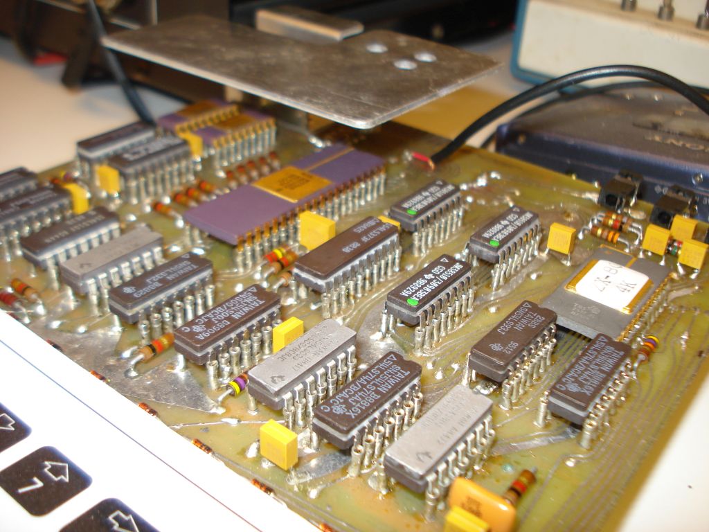 Pin 21 has been cut and connected to pin 24 (Vcc) using a small wire. It seems many EPROMs need Vpp to be connected to Vcc when operating "normally". Martin Lukasek did not do this rewiring at all and his computer worked ok. He did not use the ceramic side brazed version of the EPROM though, he has used the TMS2532JL, which has a black/brown ceramic DIP case. My EPROM, shown on the right picture above, is the TMS2532JL, with a ceramic side brazed case. I found that I did not have to connect pin 21 to the Vcc (pin 24), in order to solve the problem. I just cut pin 21 and left it unconnected, so that it cannot touch the socket pin below it. Problem solved!