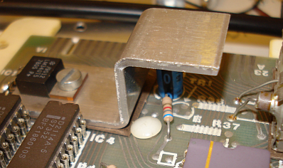 A big heat sink has been mounted onto the motherboard and extended upwards to allow for greater cooling. A small piece of PCB material, with no copper at all on both sides, has been inserted between the heat sink and the motherboard, to prevent the heat sink to short circuit the ZX80 bus lines that pass below it. A small hole has been done at the center of this rectangular piece, to allow the regulator mounting screw to pass through it and screwed on to the other side of the motherboard. The original ZX80 uses a thick piece of paper, which I do not find a good solution.