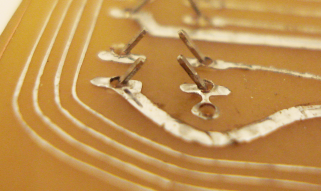 The wire bridges have to be soldered next. The picture in the beginning of this page clearly shows where the wire bridges should be soldered. The little wire bridge near the connector, cannot slip under it, so this has been soldered at the back of the PCB. This wire bridge is shown at the top left of the next picture.
