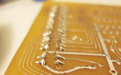 When the time comes to solder the connector, pass the connector pins through the holes and bend them slightly inwards as shown in the next photo. The reason for bending the connector pins is to support the expansion bus later on, if you decide to make another expansion card.